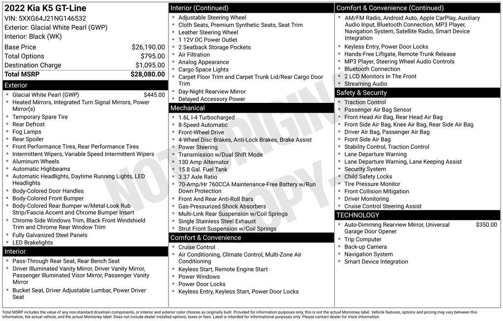 2022 Kia K5 GT-Line FWD I4 8-Speed Automatic 4D Sedan Glacial White Pearl